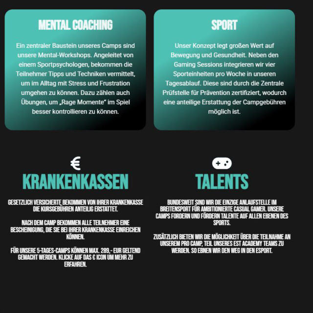 Wir sind stolz darauf, als erster Anbieter in Deutschland gamifizierte Feriencamps anzubieten. Unser Camp vereint auf einzigartige Weise, Gaming mit den klassischen Aktivitäten eines Feriencamps und bietet professionelles Coaching, Mentaltraining und sportliche Aktivierung. So schaffen wir eine ausgewogene Erfahrung, die sowohl Eltern als auch Kinder anspricht – Spaß und Lernen gehen hier Hand in Hand.